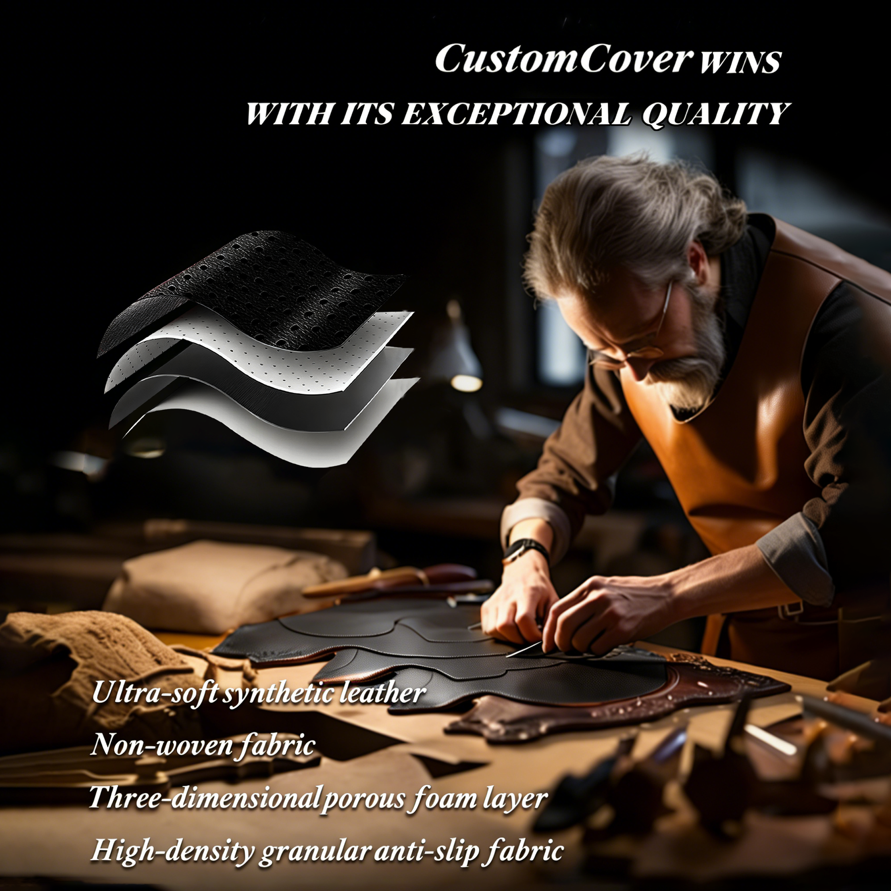 CustomCover seat covers are designed to create a comfortable and stylish driving experience for car owners. Crafted from four layers of premium leather material, they are soft and breathable, waterproof, scratch-resistant, and easy to clean.